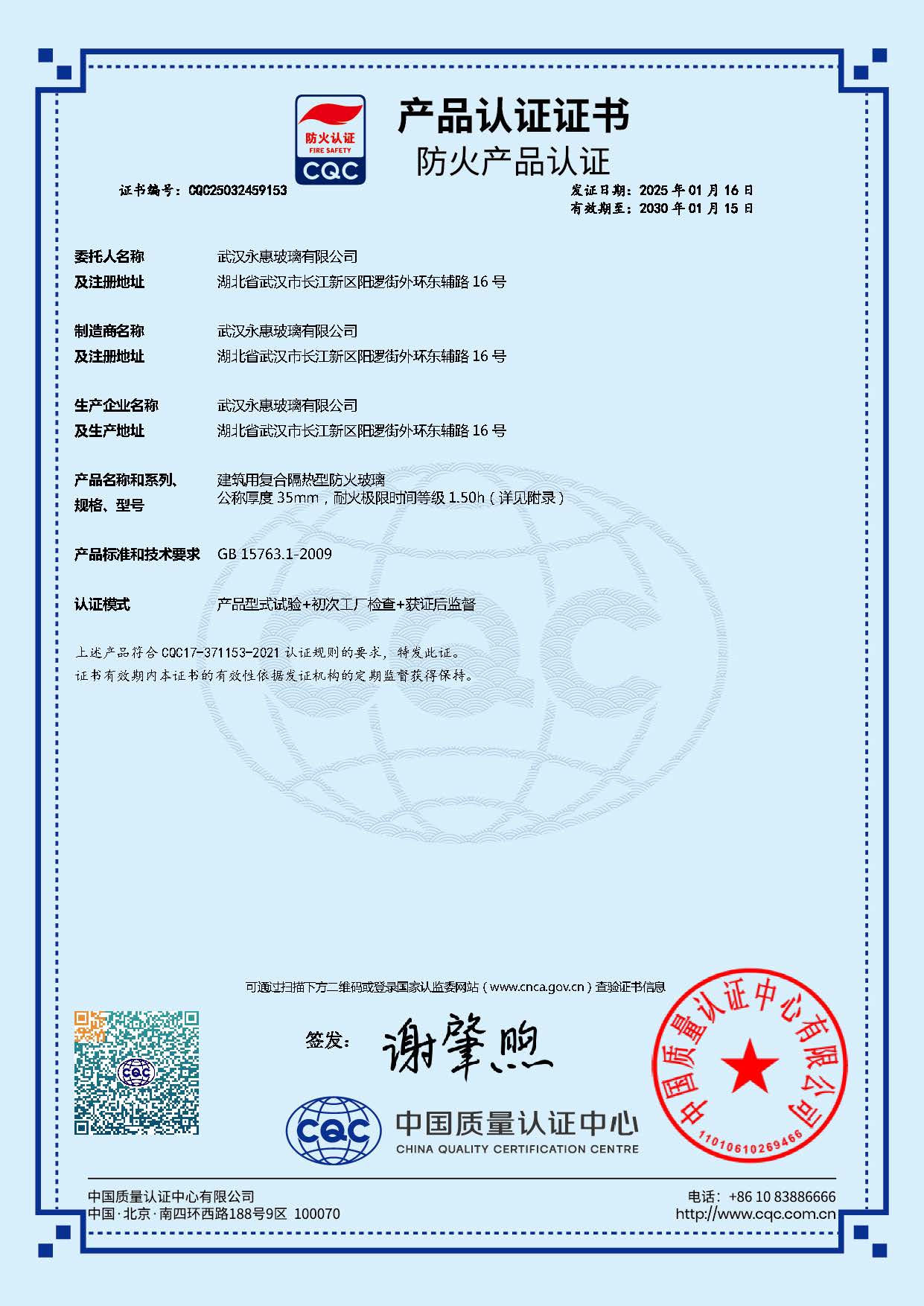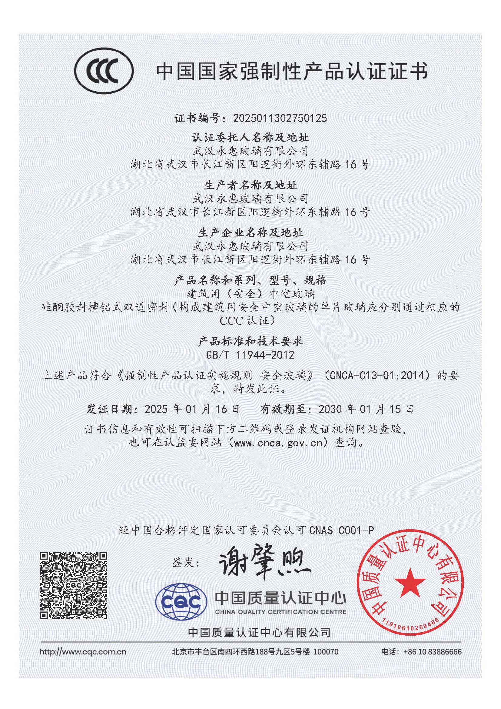 中空玻璃 强制性产品认证证书